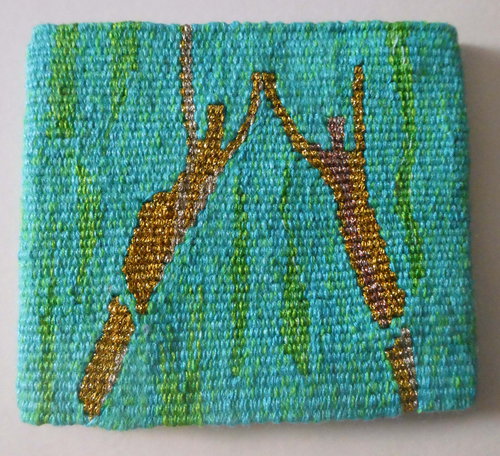 The dancers are based on a series of prints I made of prehistoric figures. My dancing figures celebrate the magical beauty of our Earth, Gaia. They remind us of both its fragility and abundance. These were made for the BTG South East Group small format tapestry exhibition, If Only.